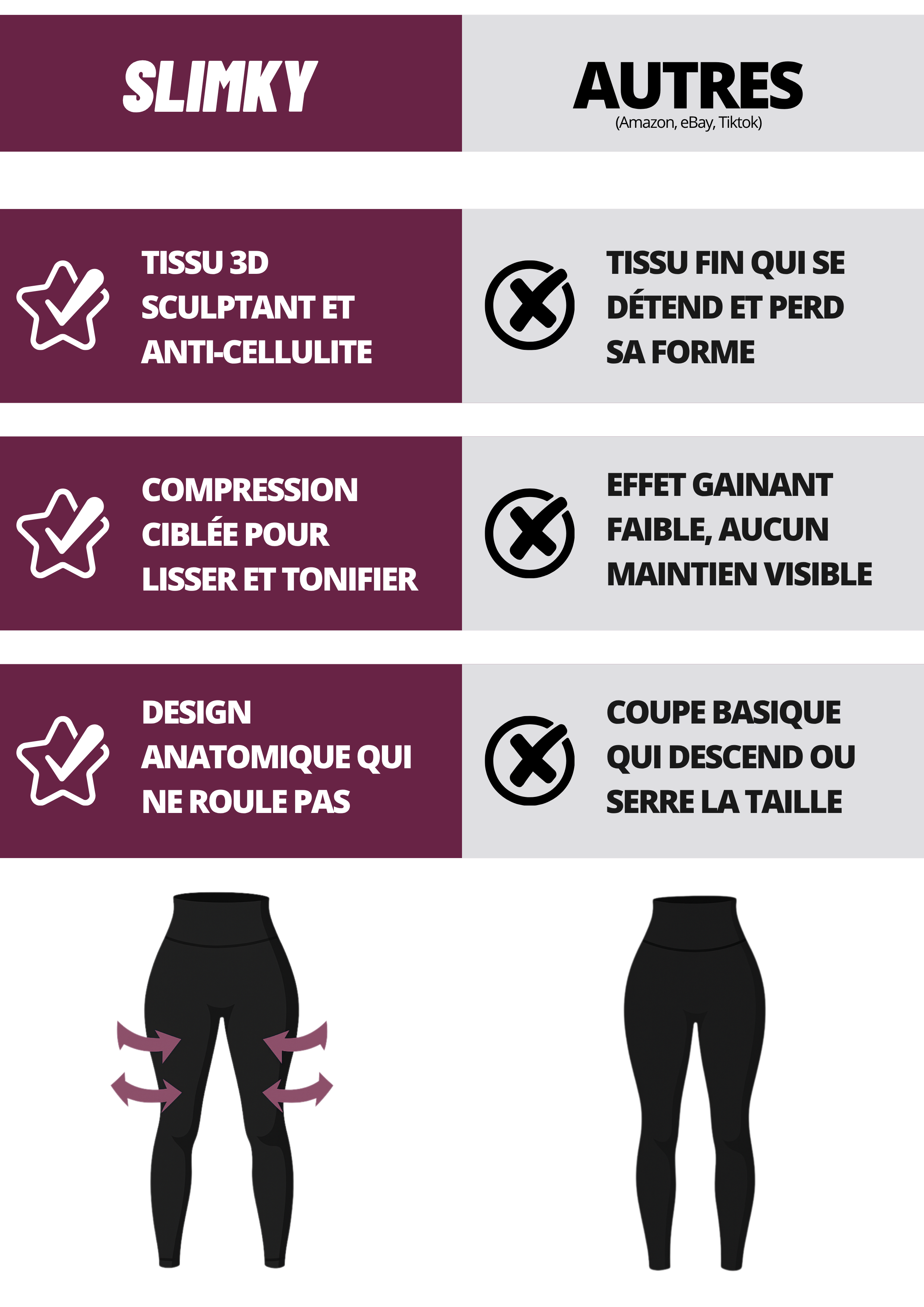 Le legging Slimky™ enveloppe, lisse et sculpte chaque courbe tout en douceur. Sa technologie 3D réactive la circulation et aide votre peau à redevenir ferme et lisse jour après jour.