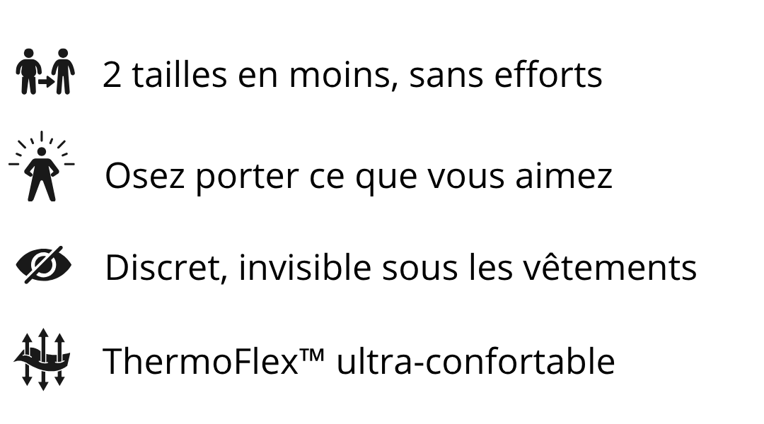 Grâce à sa technologie anti-bourrelets brevetée, SLIMKY aplatit votre ventre, camoufle votre poitrine et améliore votre posture, tout en restant 100 % invisible sous vos vêtements.