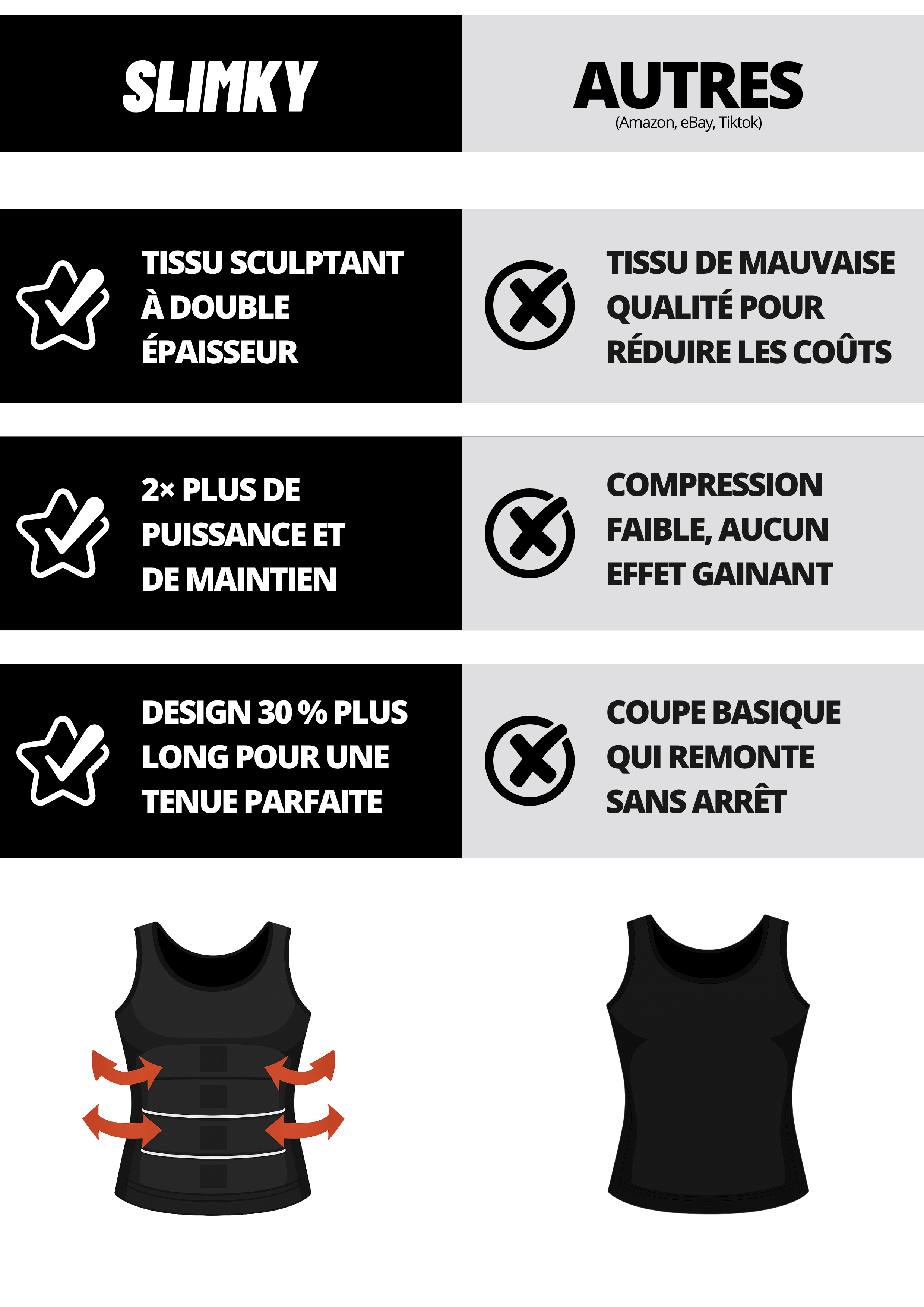 Tissu double couche : SLIMKY utilise deux fois plus de tissu que les débardeurs gainants classiques, garantissant une compression supérieure et durable.